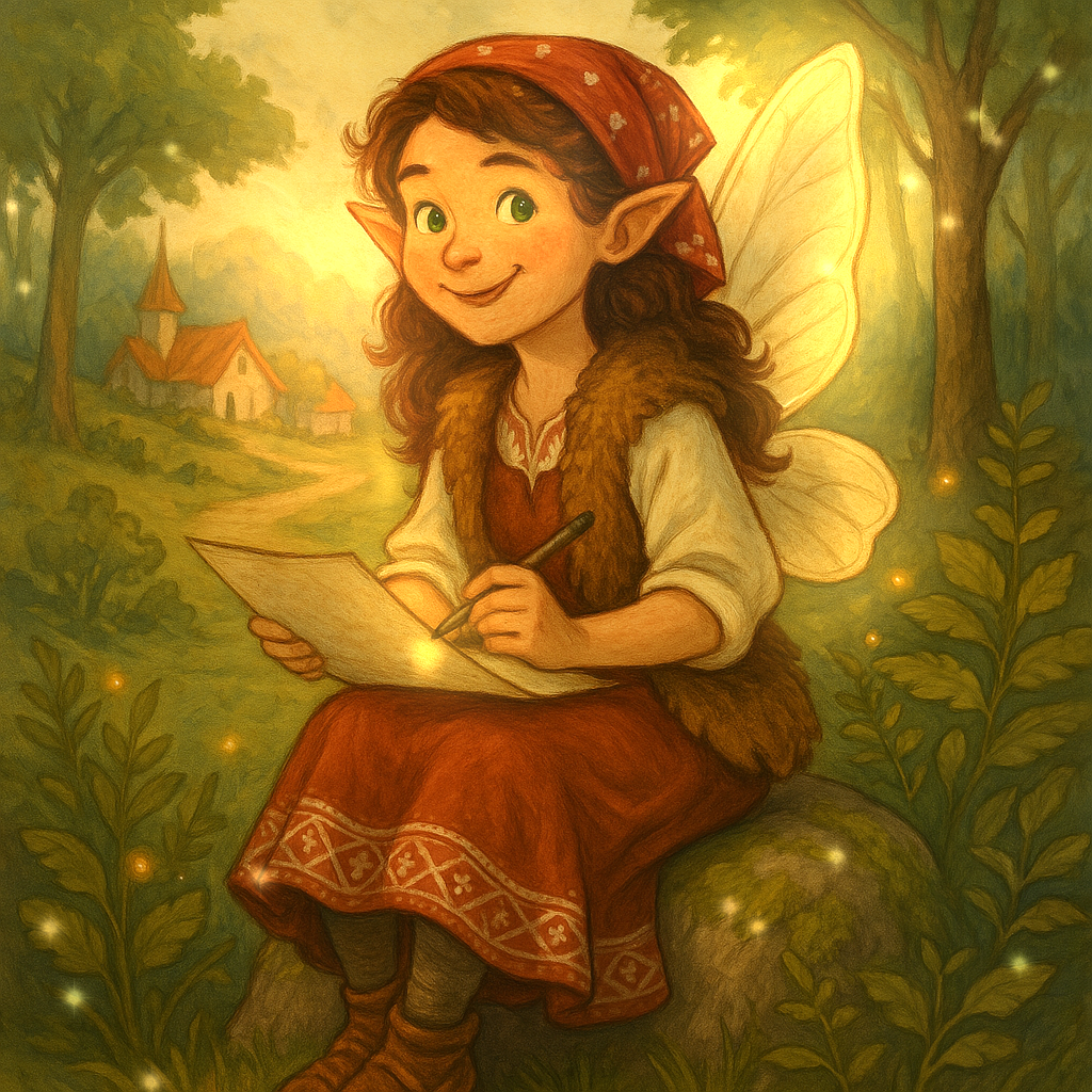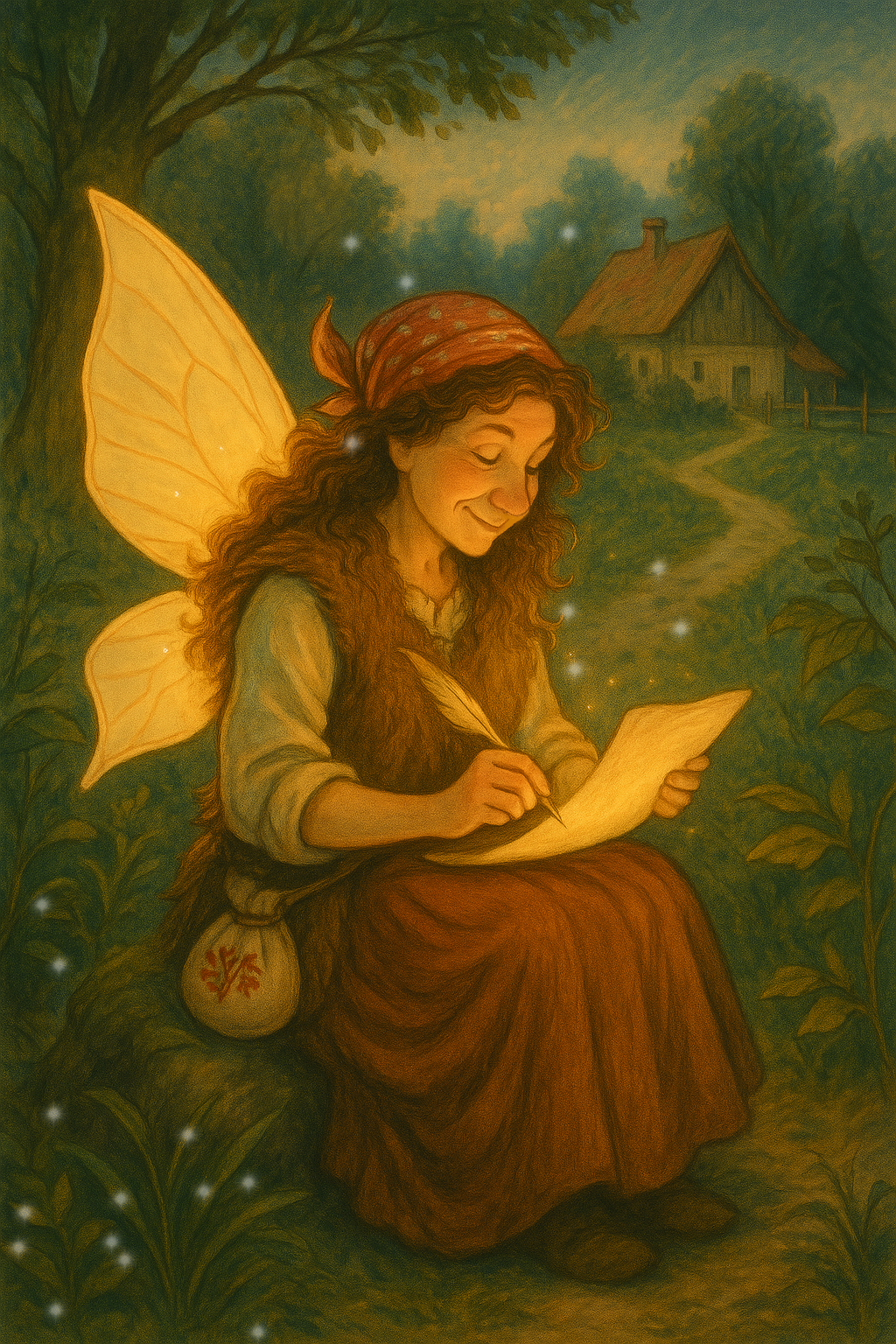 Sometimes when the moon is high and the mist curls just right , Teta Žofa shrinks just a little, sprouts wings that shimmer like embroidery, and tiptoes through the forest in search of adventure.