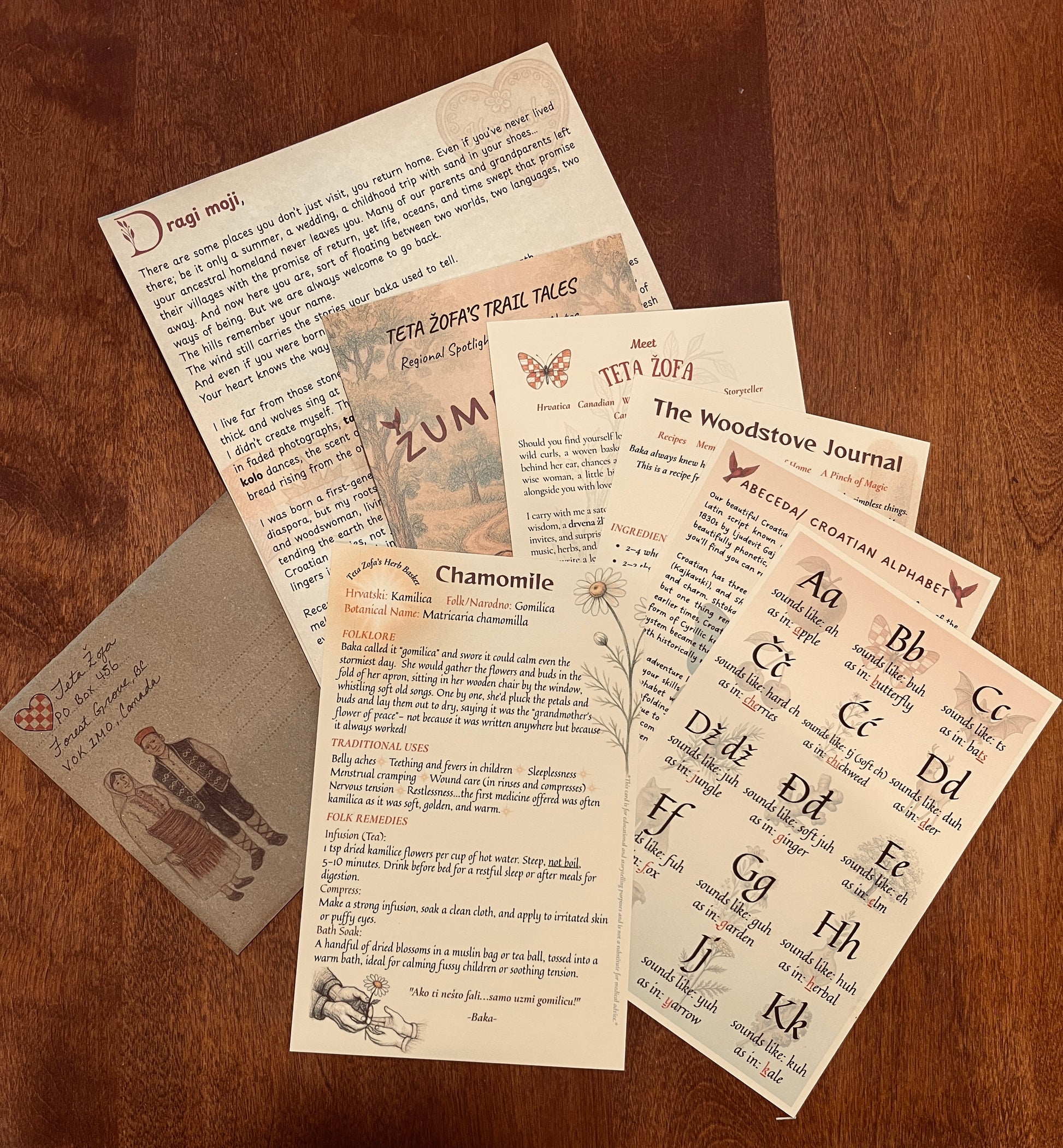 Each month, Teta Žofa wanders into a different region of Croatia, guided by memory, story, and tradition. From her basket comes a letter filled with tales, folklore, and the spirit of the land. Each letter builds from the previous one as do the language cards! However, you are still able to enjoy the adventure even if you chose the 6 month or montly options as you won't be left feeling "Cut off"!